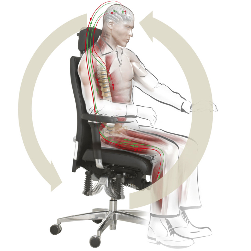 The integrated seat mechanism causes the small, ultra-fine movements of the user to be reflected, which are then transmitted back to the brain as continuous movement stimuli, where they create links in the network structure in the movement areas of the brain via various hierarchical data channels. These networks are activated automatically by the unique BIOSWING technology as you sit, making it possible to further increase the user’s performance.